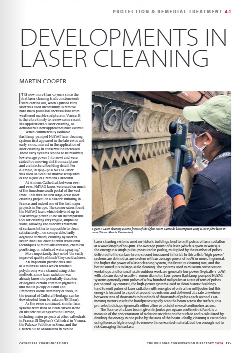 Lynton was delighted to be invited to write an article on laser cleaning for the 2024 edition of The Building Conservation Directory which has now been published. It is more than 50 years since the first laser cleaning trials on stonework were carried out in Venice and laser technology has developed significantly in that time. The article includes examples of laser cleaning projects carried out with both low and high average power systems on historic buildings in the UK, France and North America, which illustrate the types of cleaning challenges to which lasers are ideally suited. The article can be found at www.buildingconservation.com.